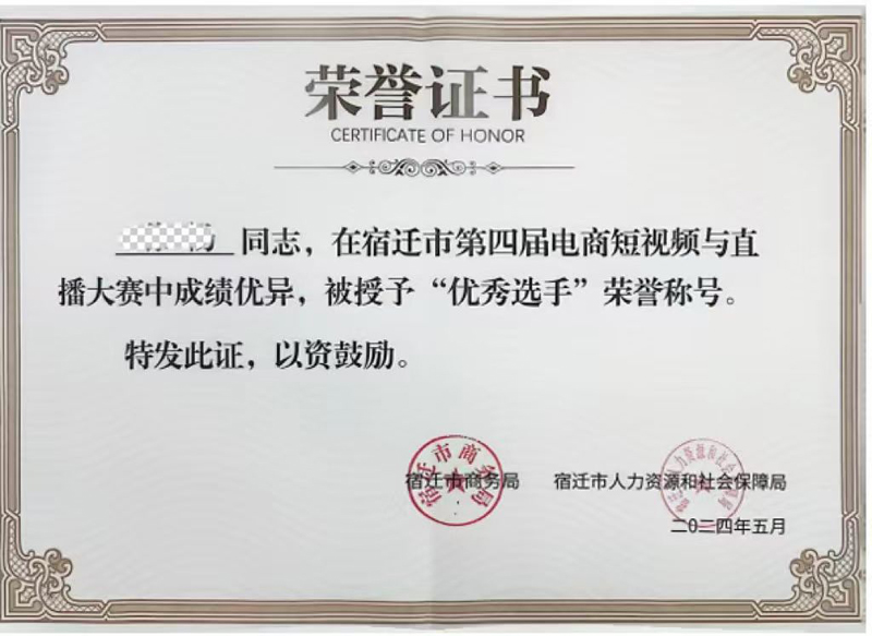 榮譽(yù)證書得獲得不僅是對(duì)參賽選手個(gè)人努力和才華的認(rèn)可,也是對(duì)蘇宿電商園在電商領(lǐng)域?qū)I(yè)人才培養(yǎng)和推動(dòng)電商直播行業(yè)發(fā)展的成果的肯定。