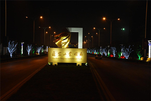在園區(qū)東入口為民河的一畔,一座座生動的城市剪影燈光造型在青海湖西路兩側(cè)一字排開。有象征著新加坡元素的“魚尾獅”,有蘇州工業(yè)園區(qū)金雞湖畔的東方之門、摩天輪和李公堤,還有西楚霸王項羽騎馬的颯爽英姿。造型以蘇州、宿遷和新加坡城市建筑輪廓線、城市主題雕塑為基本元素,以剪影形式為載體,以現(xiàn)代高科技LED燈光為表現(xiàn)手段,通過炫麗動感的光影效果,在夜色中描繪出了一副靚麗多姿的畫卷,生動地展現(xiàn)出了園區(qū)“從新加坡到蘇州再到宿遷”和“在宿遷、為宿遷”的發(fā)展理念。