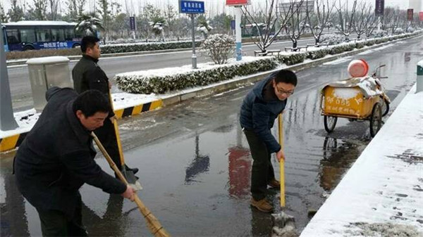 園區(qū)城管部門和建發(fā)公司迅速動員部署,啟動掃雪應(yīng)急預(yù)案,建發(fā)員工和環(huán)衛(wèi)工人不畏嚴(yán)寒,早晨六點(diǎn)鐘就走上街頭路口,揮舞著鐵鍬和笤帚,一點(diǎn)點(diǎn)地將積雪清掃干凈,經(jīng)過三小時的掃雪作業(yè),園區(qū)青海湖西路、玄武湖西路、陽明山大道等主干道已基本完成清雪工作,切實(shí)保障了市民出行。