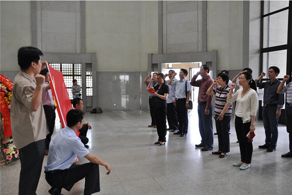 在周恩來(lái)紀(jì)念館總理雕像前,駱敏、周原敬獻(xiàn)了花籃,園區(qū)各局辦、開(kāi)發(fā)公司黨員負(fù)責(zé)同志面對(duì)鮮紅的黨旗,莊嚴(yán)地舉起右拳齊聲宣誓,重溫了入黨誓詞。