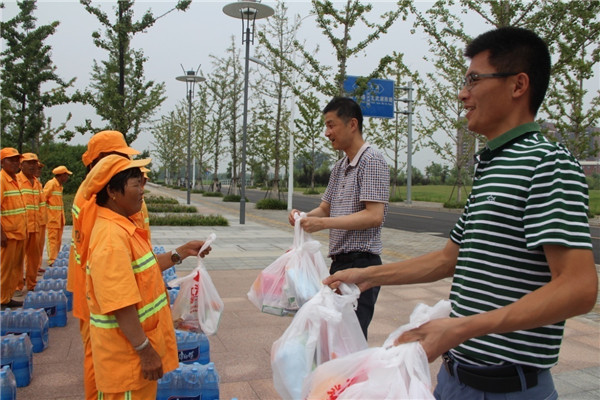 朱亞楠表示,園區(qū)環(huán)衛(wèi)工人頂著烈日,為恒大集團(tuán)等園區(qū)企業(yè)創(chuàng)造了整潔、優(yōu)美的城市環(huán)境,他代表恒大集團(tuán)宿遷項目全體人員向他們致以誠摯的敬意和謝意。許紹杰也對奮戰(zhàn)在一線的環(huán)衛(wèi)工人表示感謝和祝福,多次叮囑他們高溫作業(yè)要注意安全,勞逸結(jié)合。