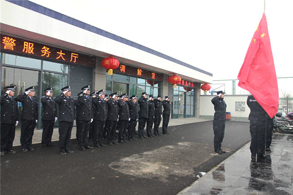 2月8日上午8時(shí)50分,根據(jù)第三次“忠誠教育周”活動(dòng)安排,園區(qū)分局全體民警、輔警在分局辦公大樓前冒著大雪舉行升國旗等“忠誠教育周 ”主題活動(dòng)。